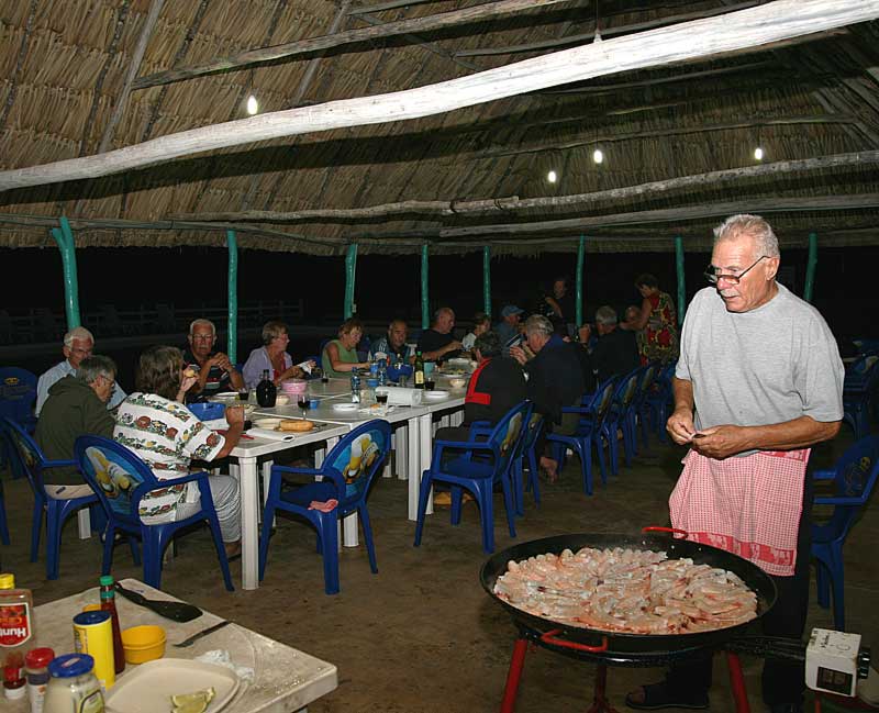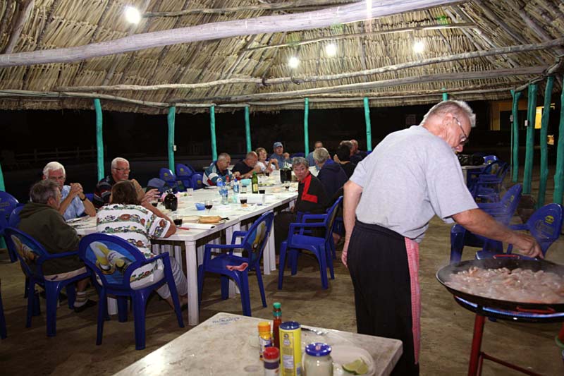 und so sieht es am Abend unter dem Strohdach aus: Gute Stimmung, Wein und Schrimps bis zum Abwinken! |